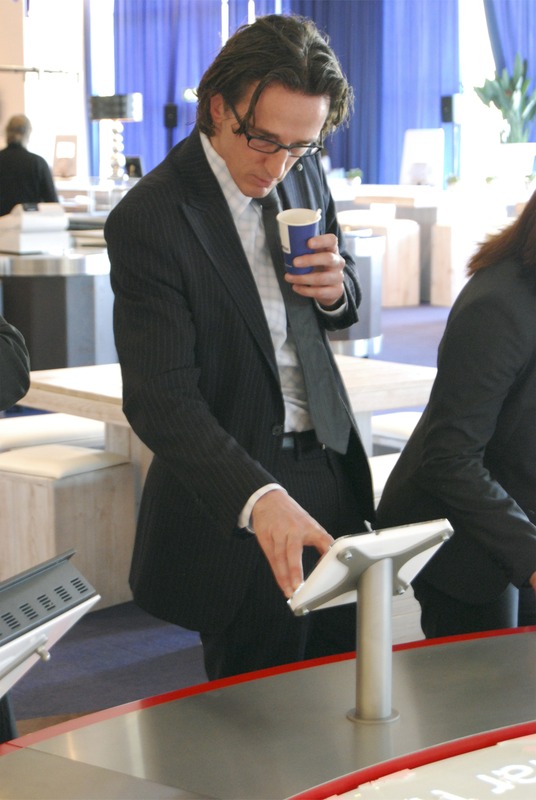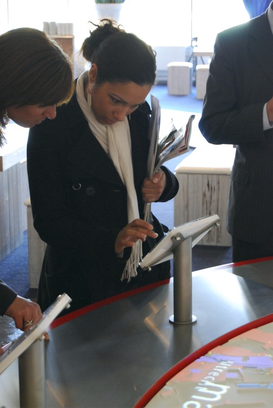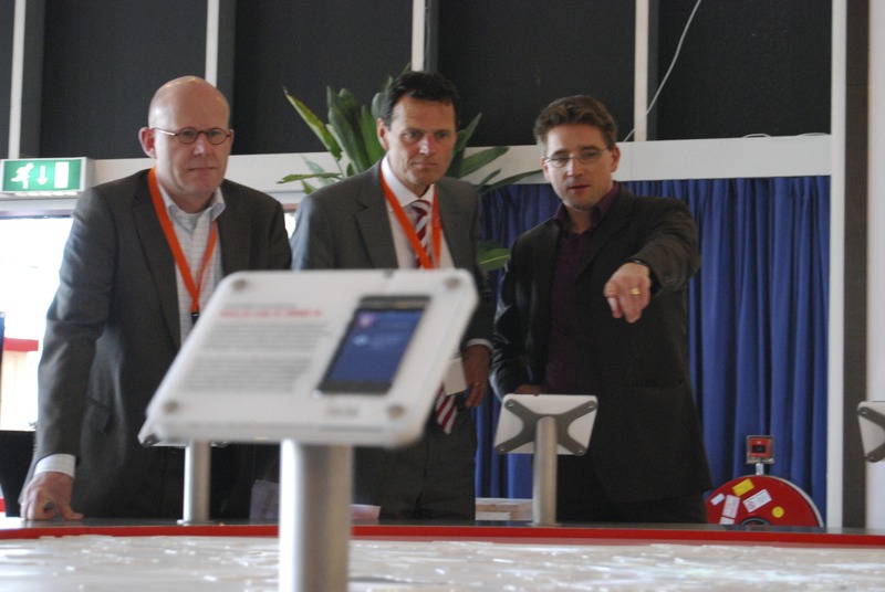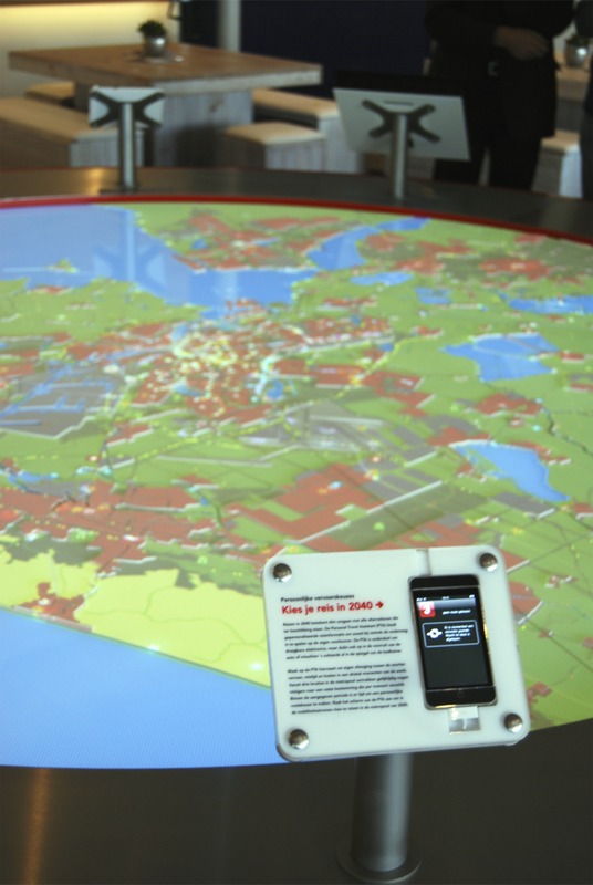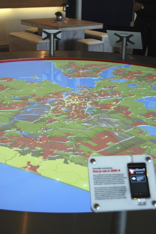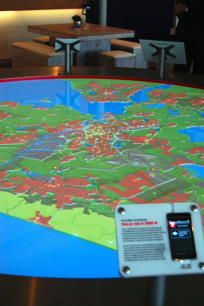 The visualisation is projected from overhead on to a 6m diameter circular relief map table. Visitors to the installation can interact with the visualisation using 9 iPod devices installed around the table. Currently on display at Amsterdam RAI.