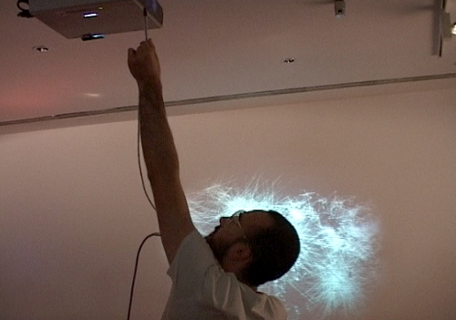 With specialized devices sensitive to changes in electromagnetic fields, detected changes are converted into electrical signals and a unique landscape of sound and structure is slowly uncovered. Snarling wires pulsate and grow in wild masses, cellular-like forms explode as bit torrents download files, and subtle reeds dance and dangle as cellular phone signals cross the room.
